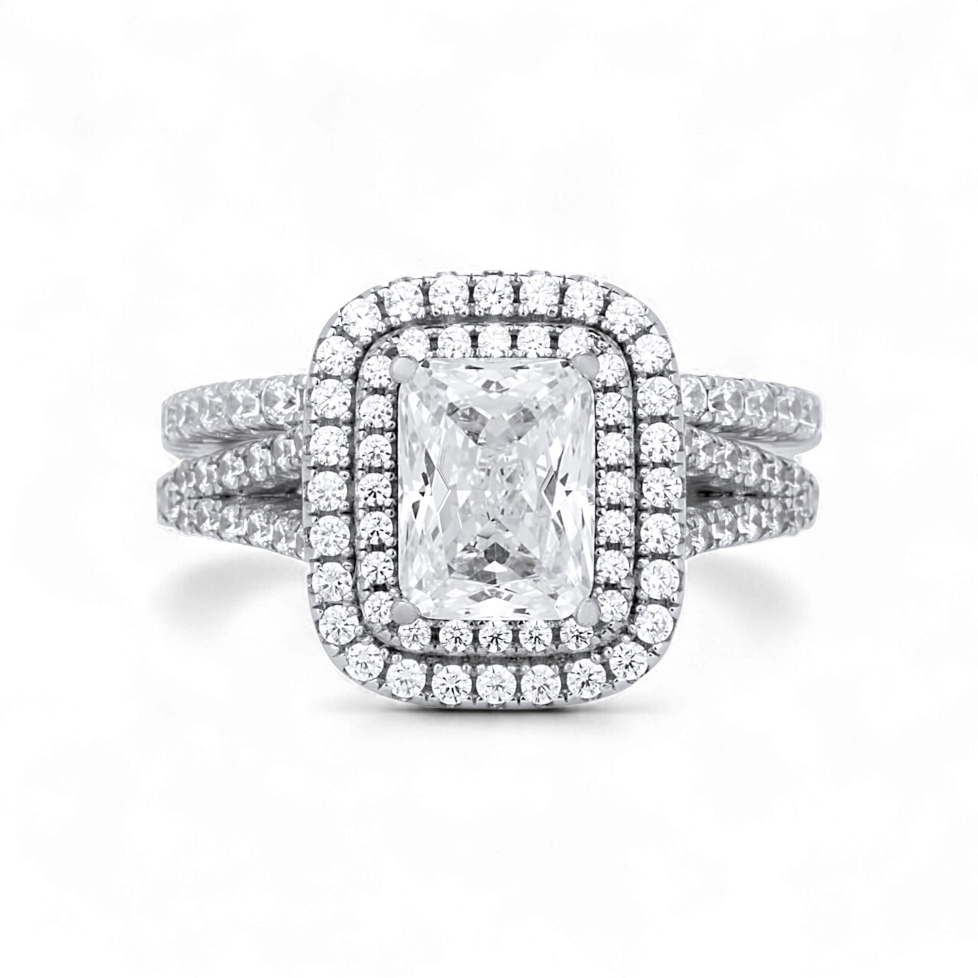 Modern sparkle meets timeless elegance in the Kylie Radiant Cut CZ Bride Set in 925 sterling silver. At the center of this stunning set is a radiant-cut cubic zirconia, expertly faceted to combine the brilliance of a round cut with the clean lines of an emerald cut. The result is a captivating centerpiece that glows with clarity and sophistication.