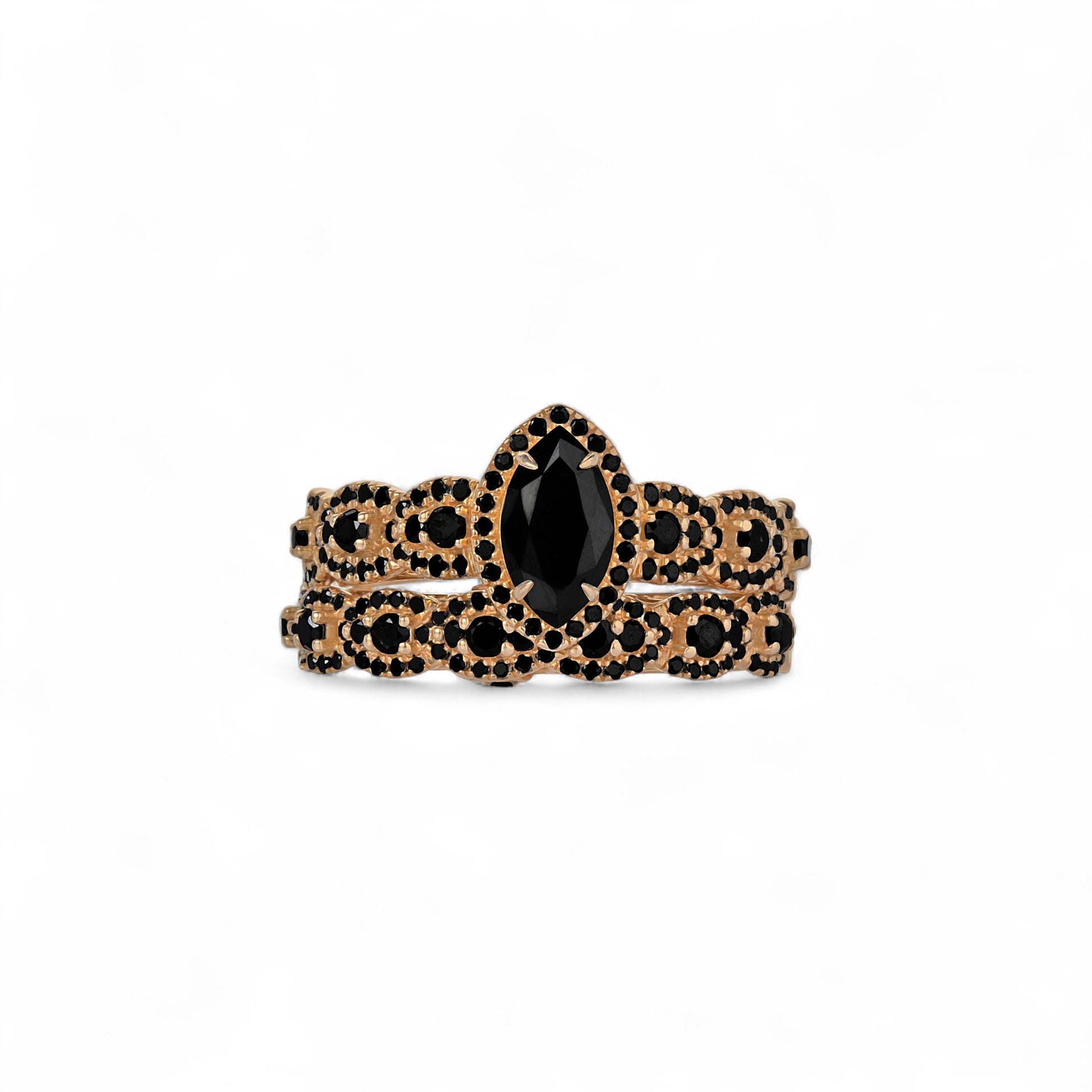 The Ruby Marquise Cut Black Diamond Cluster Bride Set in 18 Karat Gold is a bold declaration of eternal love and individuality, featuring a striking marquise-cut black diamond at its center, surrounded by a dramatic cluster of pavé-set black diamonds that extend across both bands. Handcrafted in radiant 18K gold, this bridal set combines elegance with edge, creating a unique design that commands attention. The marquise cut symbolizes vision and strength, while the deep black diamonds embody mystery, passion, and enduring devotion, making this piece the perfect choice for a love story as rare and fearless as yours.
