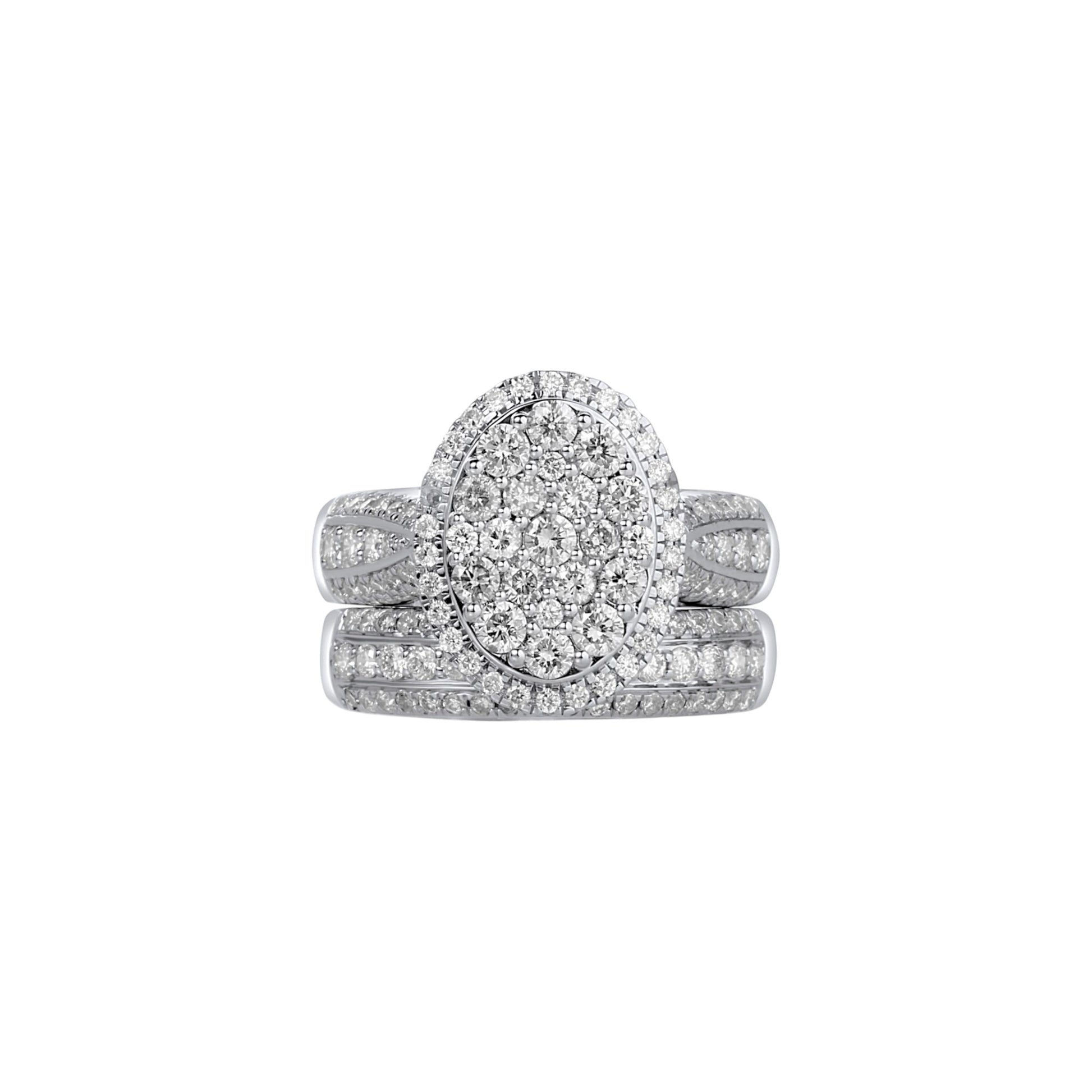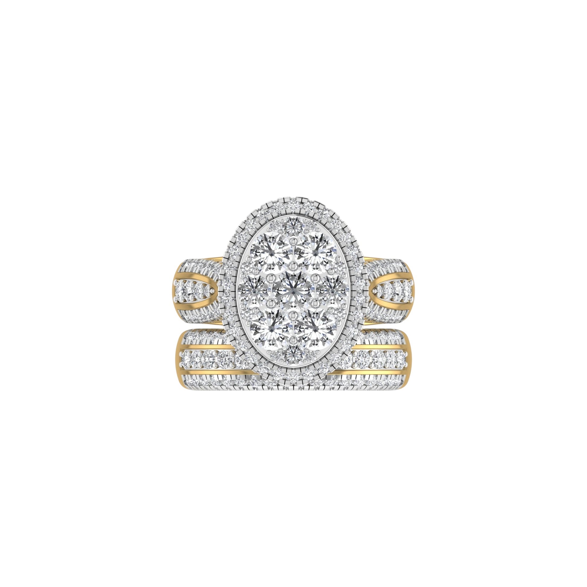 The Amanda Oval Cut Natural Diamonds Bride Set in 18 Karat Gold is a dazzling symbol of romance and everlasting devotion, featuring a breathtaking oval diamond cluster centerpiece framed by a halo of brilliant round diamonds. Handcrafted in luminous 18K gold, the engagement ring is paired with a matching diamond-studded wedding band, creating a seamless union of fire and brilliance. The oval cut represents harmony, grace, and continuity, while the intricate detailing reflects the strength and beauty of a love destined to endure for a lifetime. cherished moments