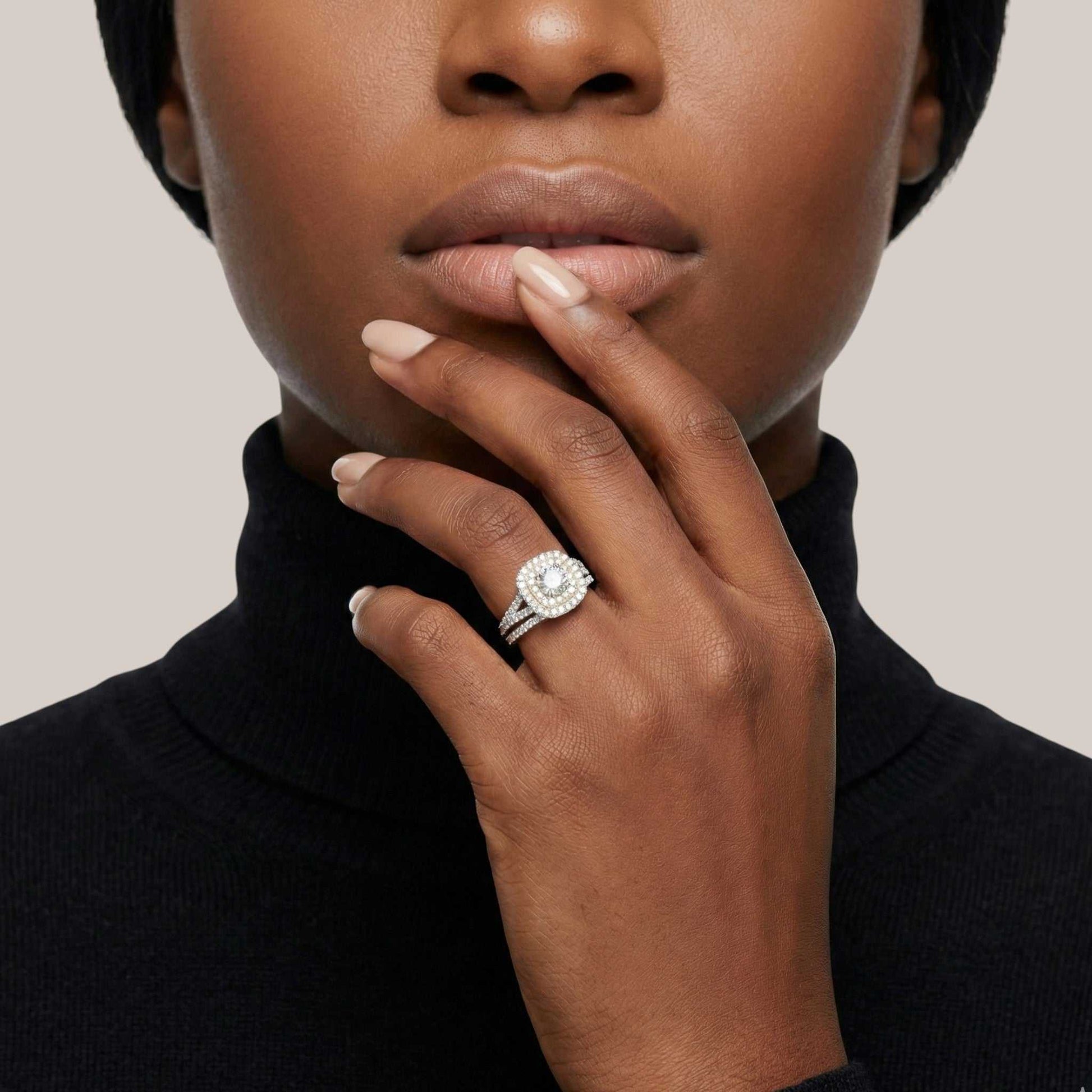 Timeless charm meets modern brilliance in the Audre Cushion Cut Moissanite Bridal Set. At the heart of this elegant set is a stunning cushion-cut moissanite, expertly faceted to capture the light with fire and clarity that rivals diamonds. The engagement ring is gracefully paired with a coordinating band adorned with sparkling accent stones, creating a seamless and radiant bridal look.