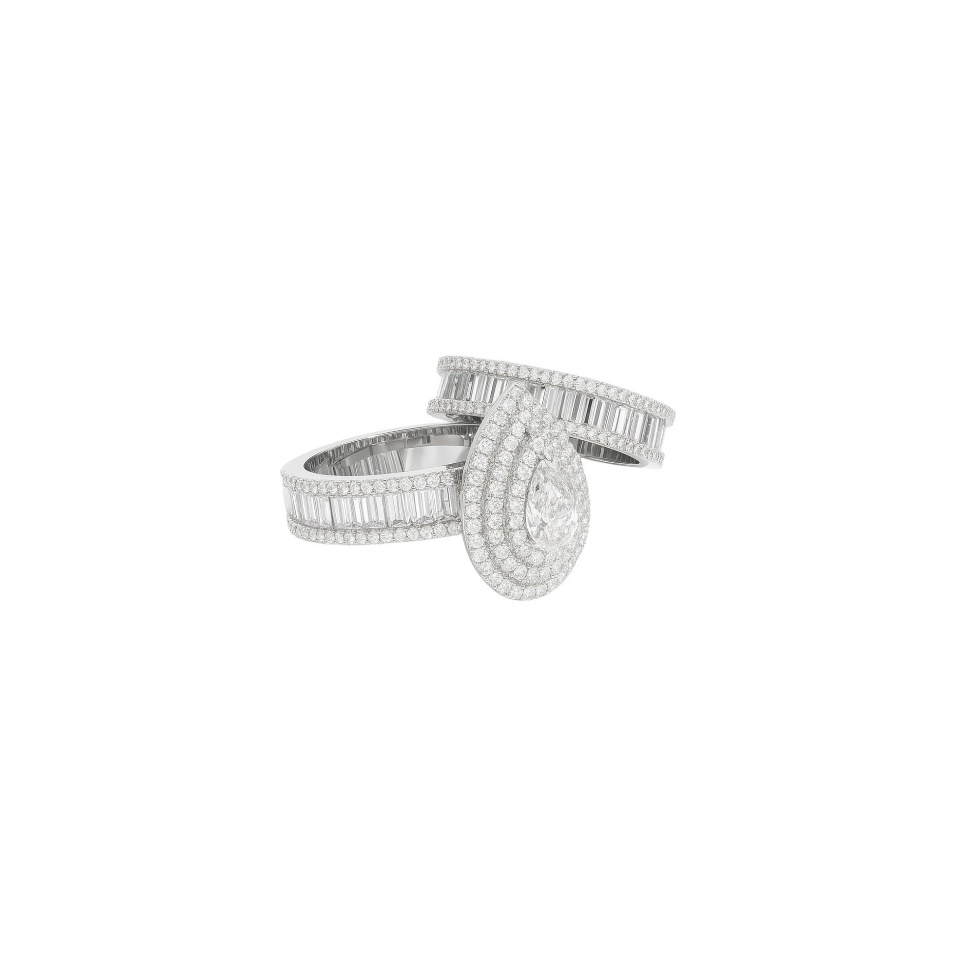 The Doris Pear Cut Certified Pavé Diamonds Bride Set in 18 Karat Gold is a radiant masterpiece of elegance and devotion, featuring a stunning pear-cut center diamond embraced by a brilliant double halo of pavé-set round diamonds. Handcrafted in luminous 18K gold, the set is further elevated with rows of channel-set baguette diamonds along the band, creating a captivating blend of fire and sophistication. The pear cut, often called the teardrop of joy, symbolizes romance and enduring love, while the intricate detailing of this design reflects the strength and brilliance of a forever bond. Crafted for the bride who desires both grandeur and timeless elegance, the Doris Bride Set is a dazzling testament to love that shines endlessly.
