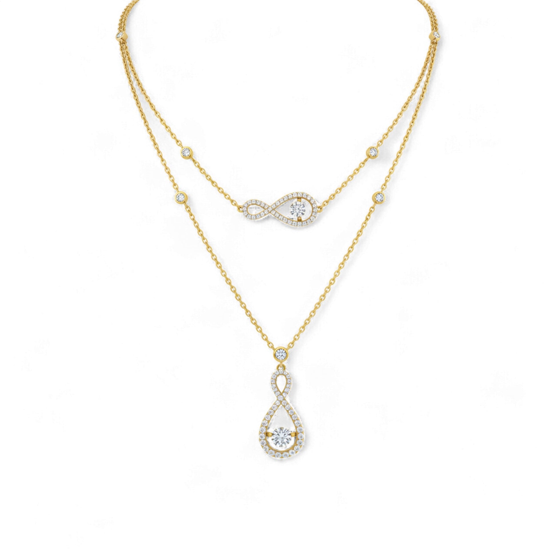 The Layered Twinkle Infinie Diamond Necklace is a statement of quiet luxury and eternal connection. Designed with two delicate layers, it features a graceful infinity motif on the upper chain and a radiant teardrop pendant below, each accented with shimmering diamonds that catch light from every angle. Handcrafted in luminous 18K gold, this piece blends timeless design with a modern, effortless allure, making it perfect for both elegant evenings and everyday sophistication.