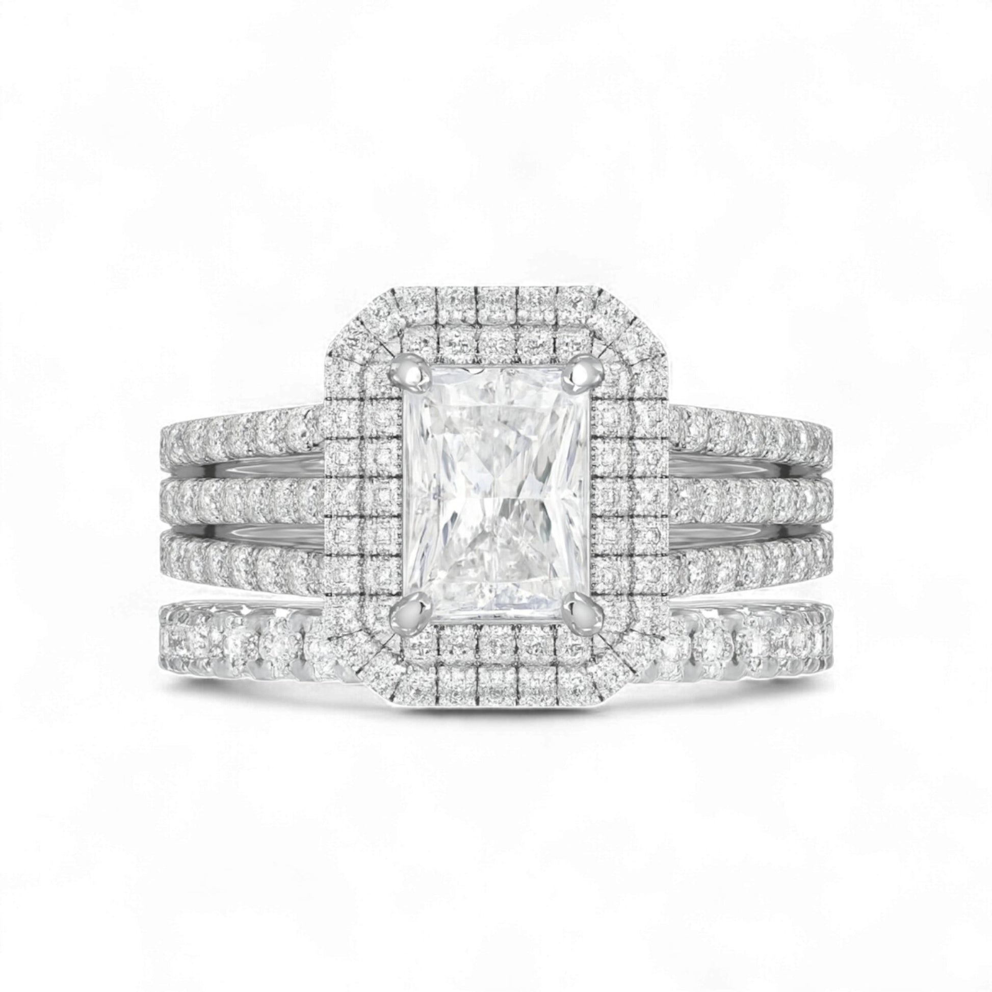 Brilliant, bold, and eternally elegant the Lovely Radiant Lab Grown Diamond Bride Set in Platinum is a stunning celebration of modern romance. At the center, a captivating radiant-cut lab grown diamond dazzles with fiery brilliance and clean, geometric lines, set in a sleek platinum band that reflects strength and purity.
