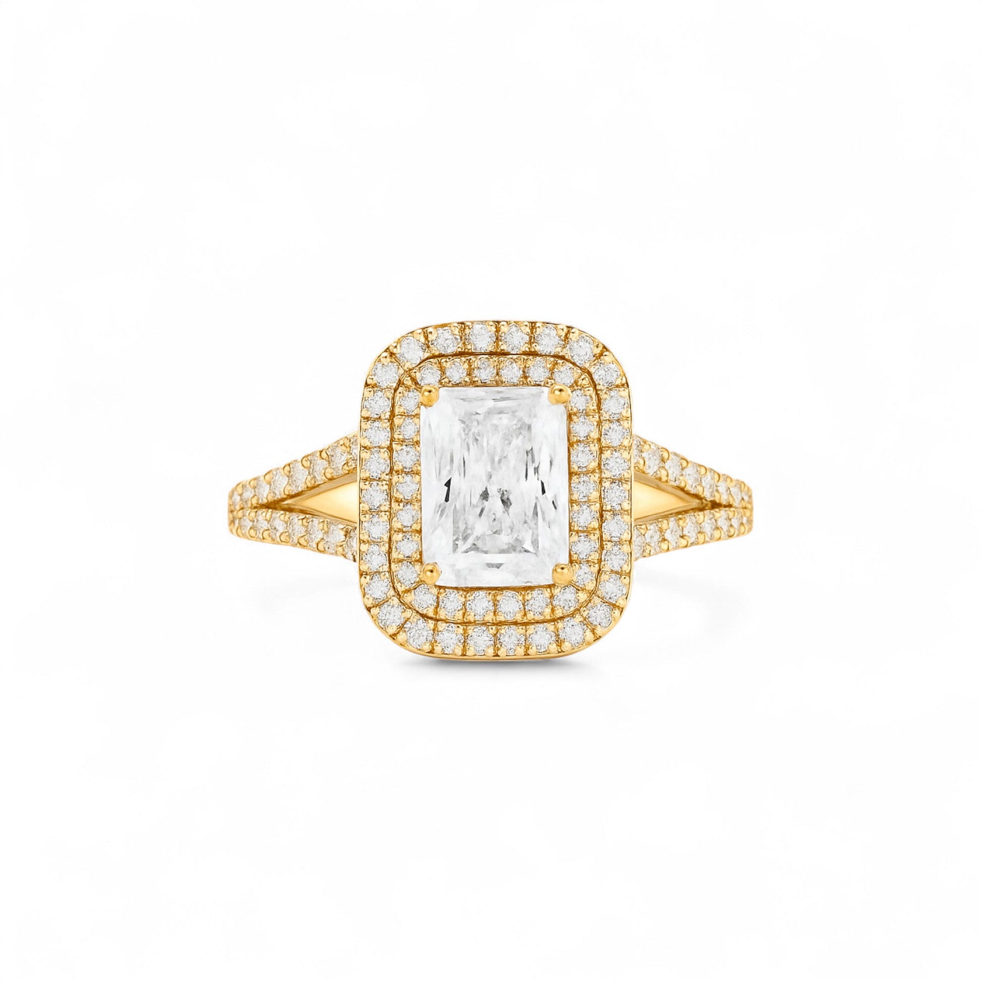 The Kylie Radiant Cut Moissanite and Natural Diamonds Engagement Ring in 18K Gold is a striking blend of brilliance and craftsmanship. Featuring a radiant-cut moissanite center stone encircled by a double halo of natural diamonds and a pavé-set split band, this ring is designed to dazzle with timeless sophistication and enduring sparkle.