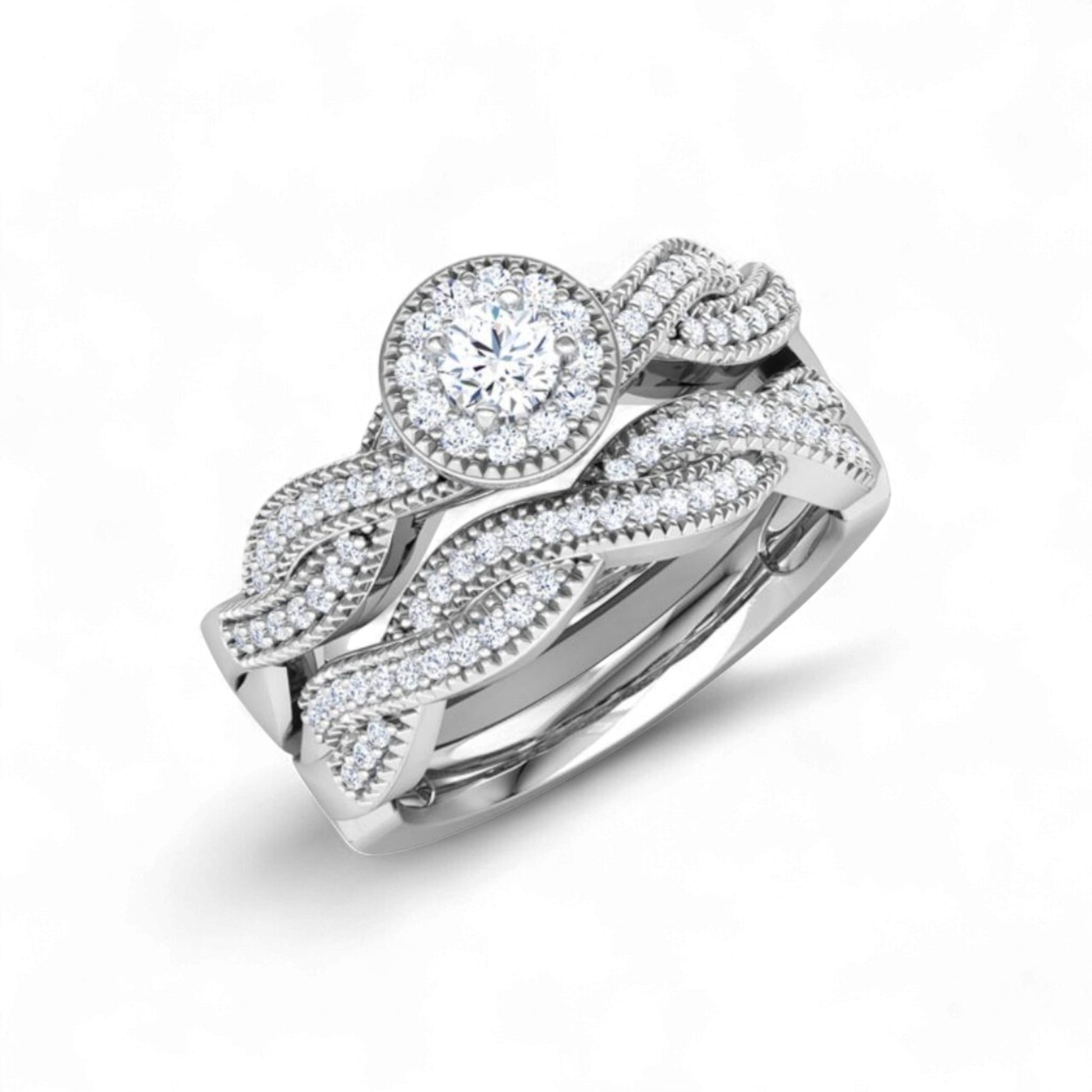 Intricate, radiant, and timelessly elegant, the Mira CZ Bride Set is crafted to capture the essence of forever. At its heart, a brilliant round CZ stone is embraced by a halo of sparkling pavé accents, amplifying its brilliance. The braided, diamond-lined bands in luminous 18K gold weave together in a stunning design that symbolizes two souls intertwined in perfect harmony.