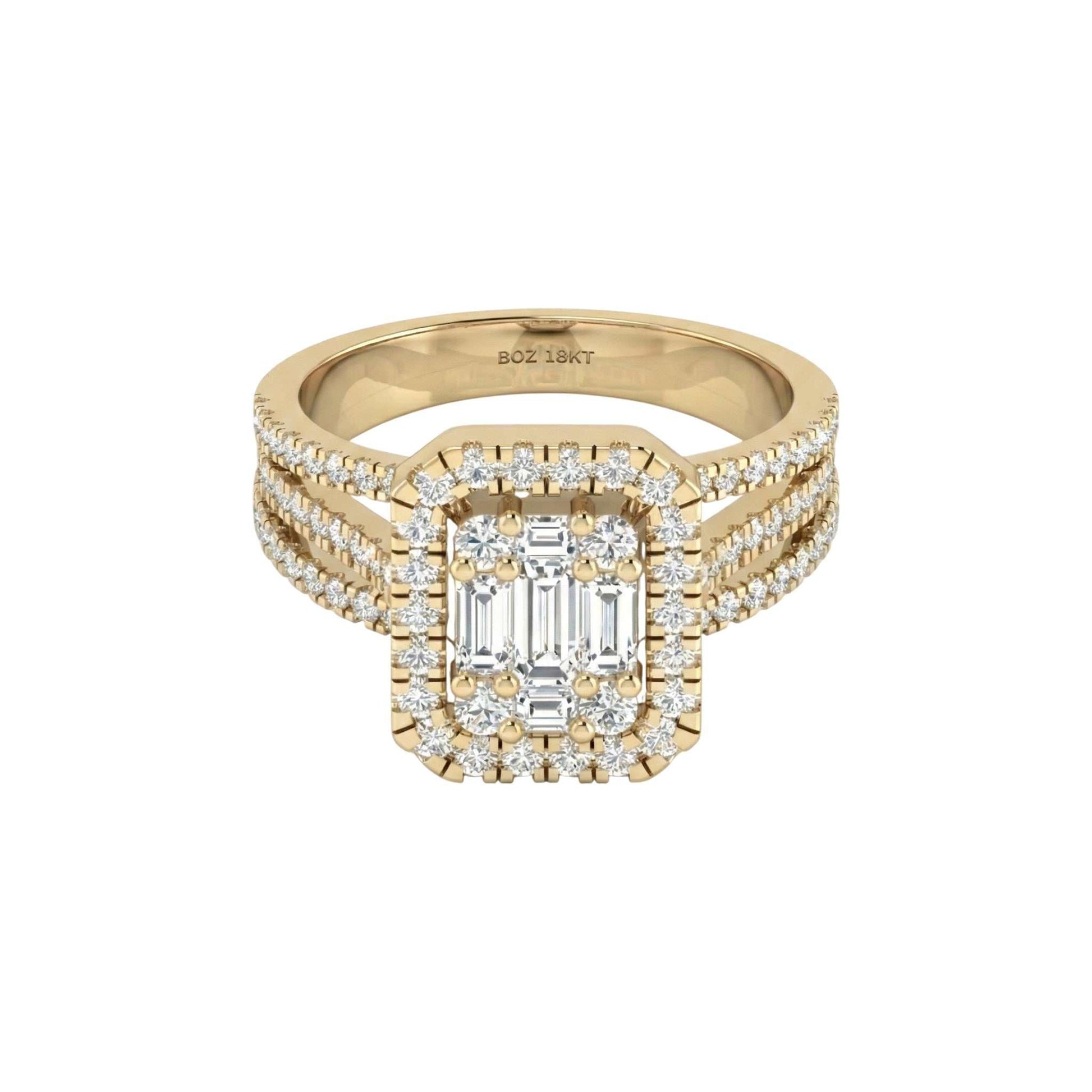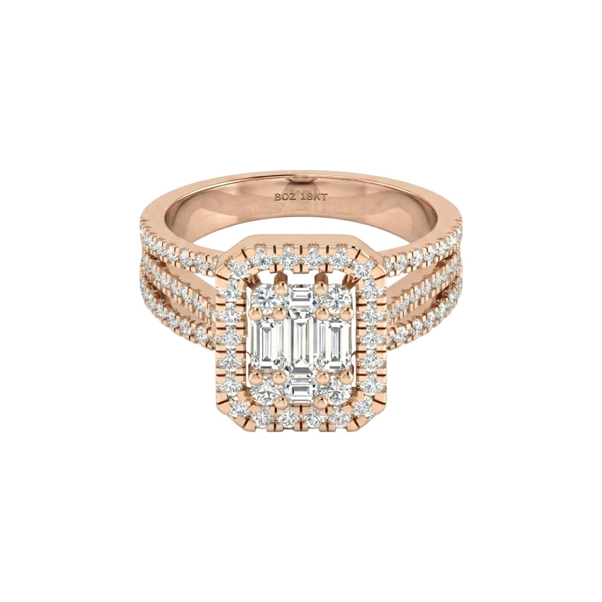 Majestic and timeless, the Royal Lovely Emerald Cut Natural Diamond Engagement Ring is crafted to embody both elegance and grandeur. Handset in luminous 18KT gold, the centerpiece showcases a captivating emerald-cut natural diamond, admired for its clarity and step-cut brilliance. A double halo of round natural diamonds enhances its radiance, while the triple-split pavé band adds depth, fire, and sophistication to the design.