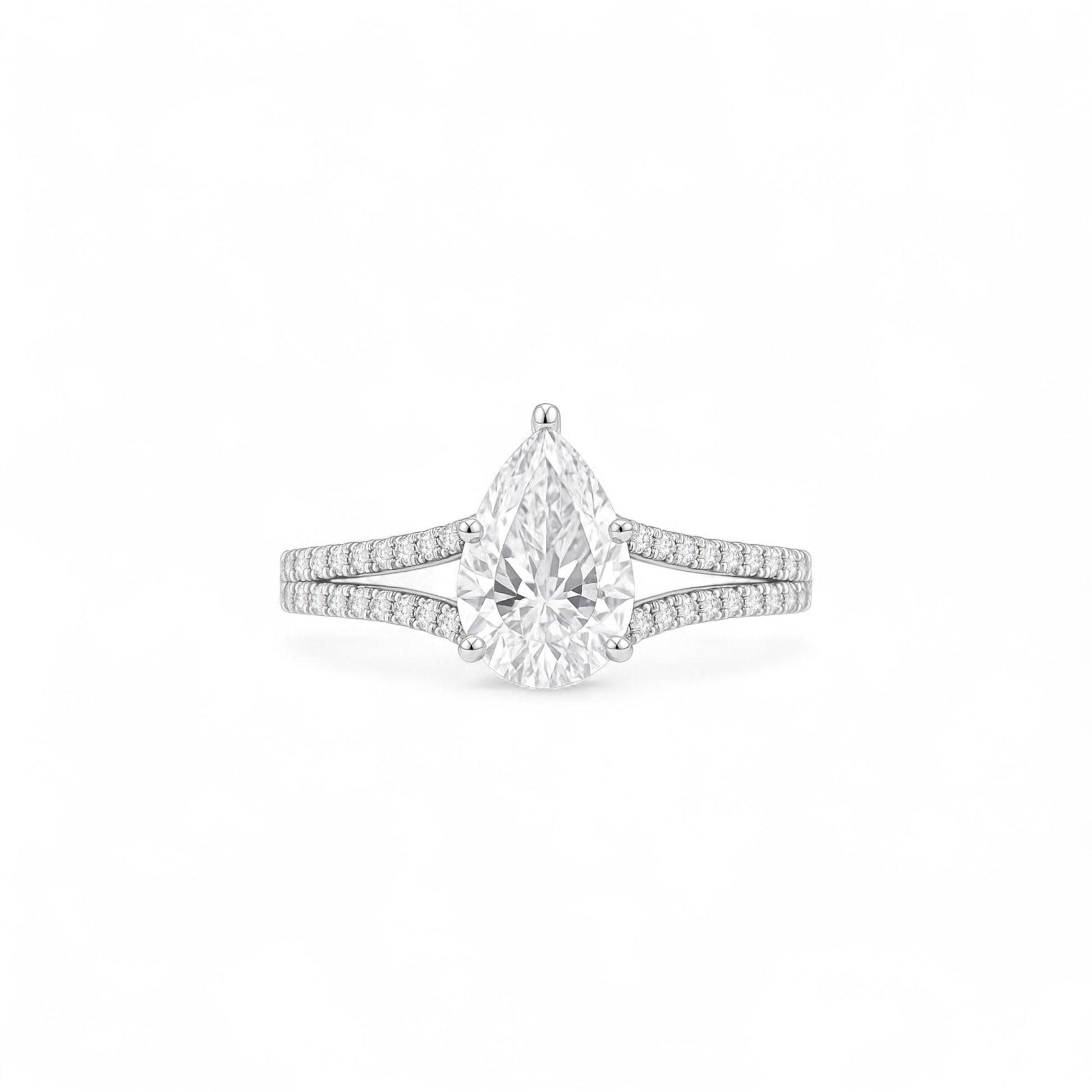 Striking and elegant, the Split Shank Pear Cut Moissanite Engagement Ring is a timeless declaration of love. Set in polished sterling silver, the luminous pear-shaped moissanite takes center stage, symbolizing grace and devotion. Its brilliance is amplified by a split shank design, lined with pavé-set stones that shimmer with every movement, creating depth and radiance from every angle.