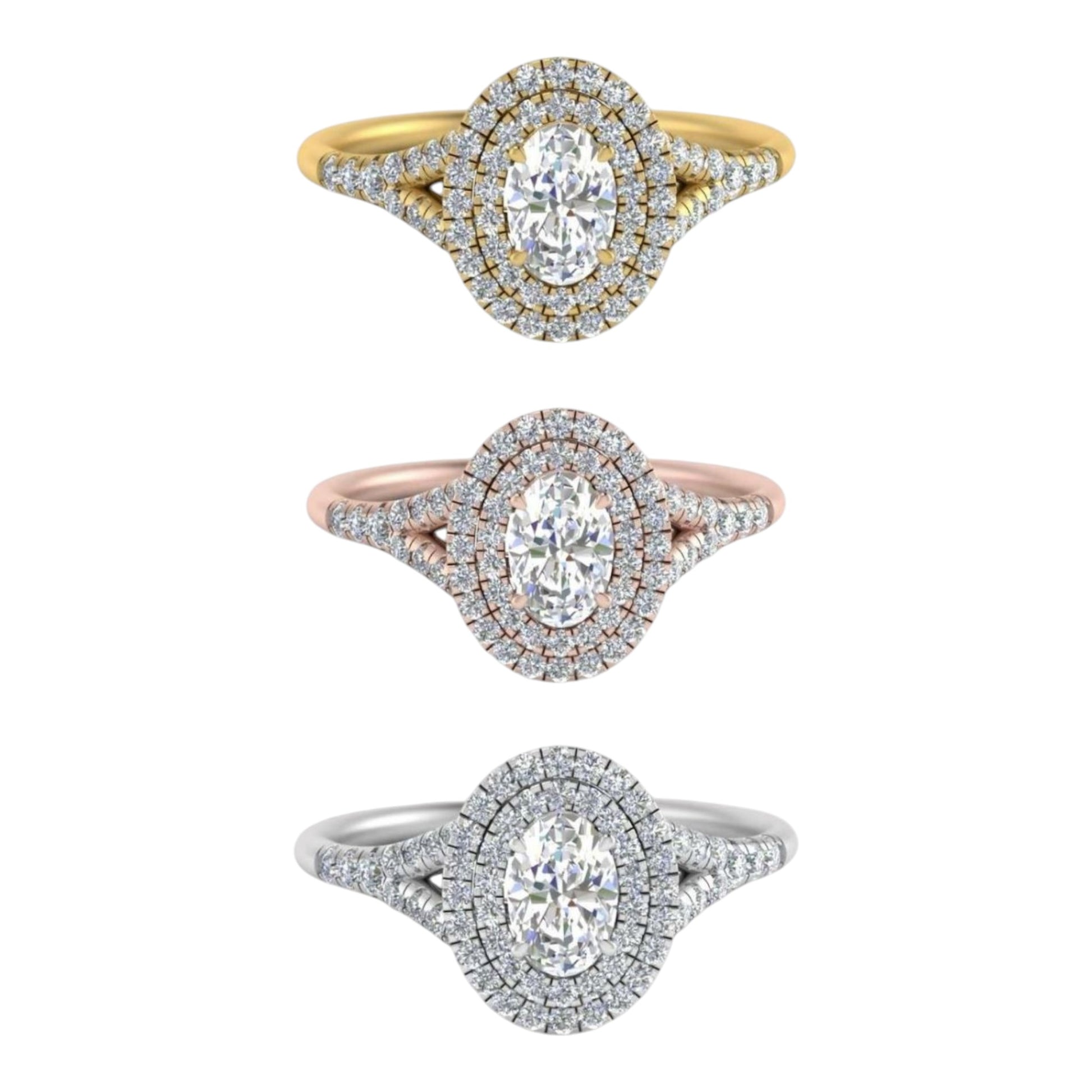 he Zuri Diamond Engagement Ring is crafted in luminous 18 Karat gold and showcases a GIA-certified VVS1 G 0.30ct diamond, radiating brilliance with every glance. A stunning oval-cut centerpiece rests at the heart, embraced by a double halo of meticulously set natural diamonds, amplifying its sparkle and grace. The split-shank design adds dimension and elegance, with accent diamonds flowing seamlessly along the band, ensuring brilliance from every angle.