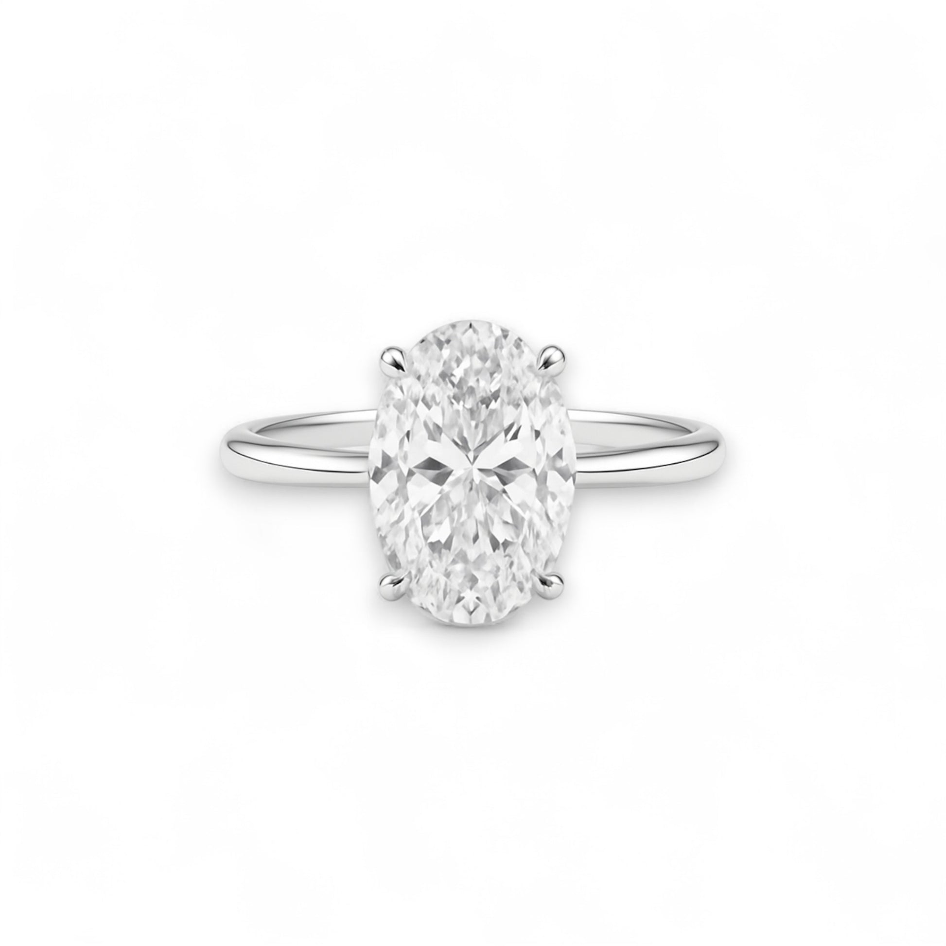 Crafted in luminous 18K gold, this engagement ring embodies the elegance of timeless simplicity. At its heart sits a dazzling oval-cut VVS1 D Moissanite, available in 3ct or 4.5ct, radiating fire and brilliance from every angle. Beneath the center stone lies a hidden crown of natural diamonds, adding depth and sparkle with every movement, a secret detail only the wearer truly knows. Its sleek solitaire design offers a refined balance between classic sophistication and modern allure, making it a versatile treasure for a lifetime.