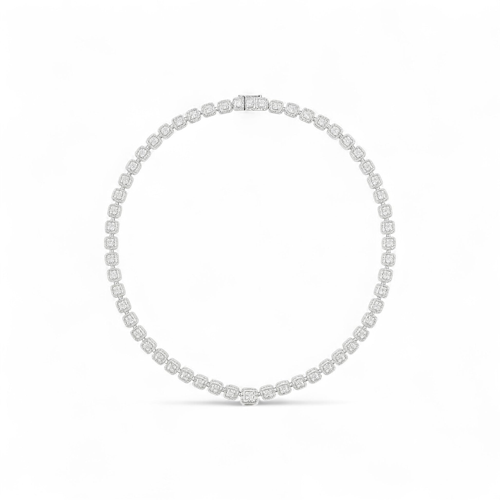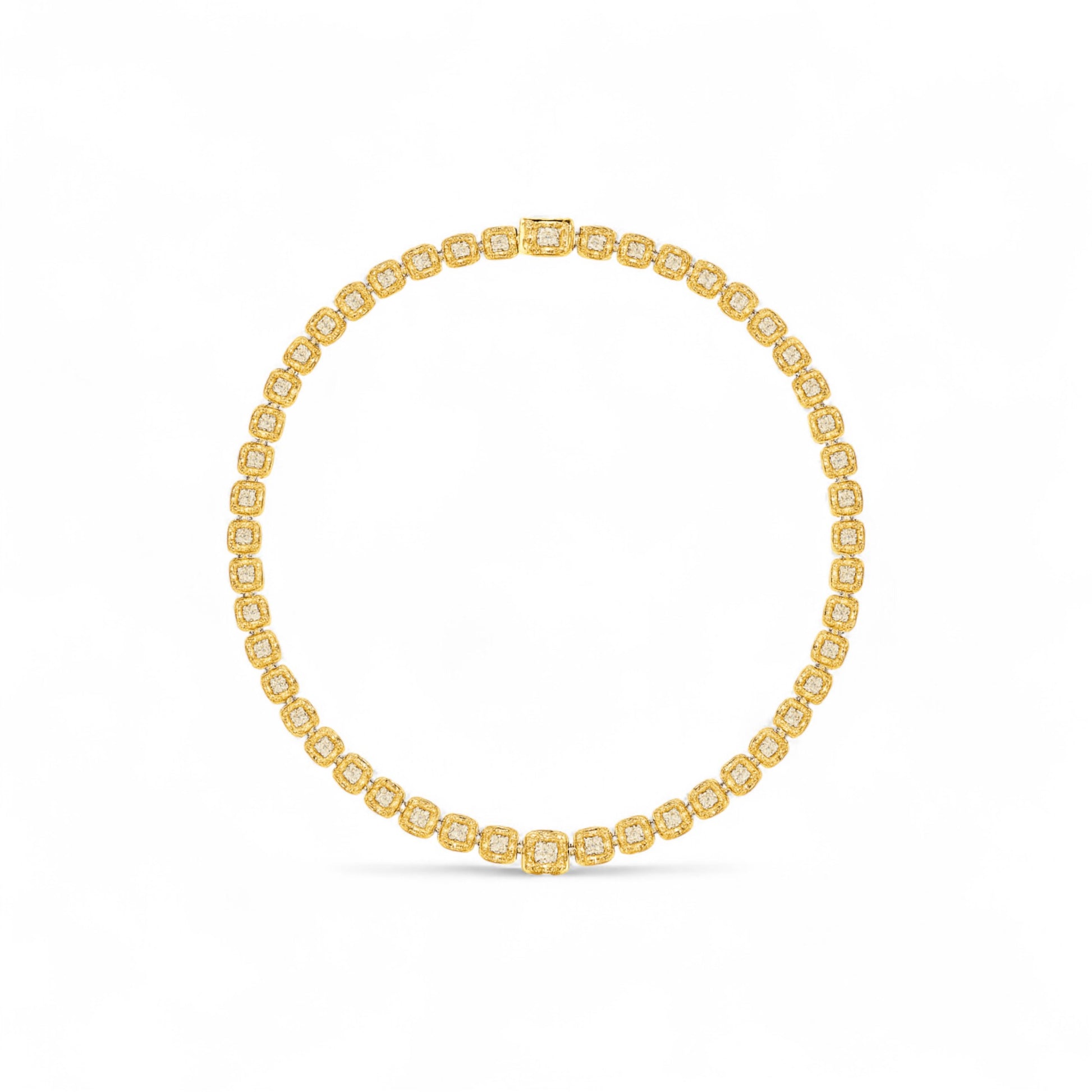Each diamond is meticulously set in a seamless tennis-style arrangement, creating a harmonious rhythm of sparkle and structure. Crafted in rich 18K gold, this masterpiece drapes gracefully along the neckline, making it the perfect statement for black-tie events, weddings, or unforgettable moments.