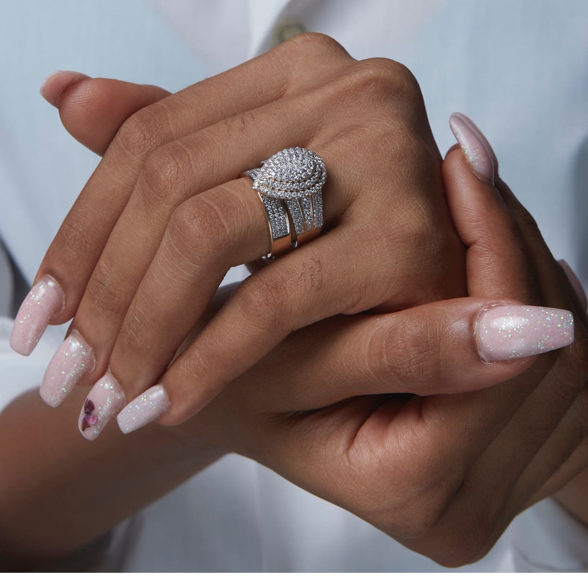 The Omoni Pear Cut Natural Diamond Cluster Bride Set is a radiant symbol of romance and devotion, showcasing a bold pear-shaped cluster of natural diamonds that sparkles with unmatched brilliance. Handcrafted in luminous 18KT gold, the engagement ring features a dramatic layered design of pavé-set diamonds that flow seamlessly into the band, paired with a matching wedding ring adorned in diamonds for continuous sparkle. The pear cut, often called the teardrop of joy, represents deep emotion and everlasting love, making this bridal set a dazzling choice for the bride who desires both grandeur and timeless elegance.