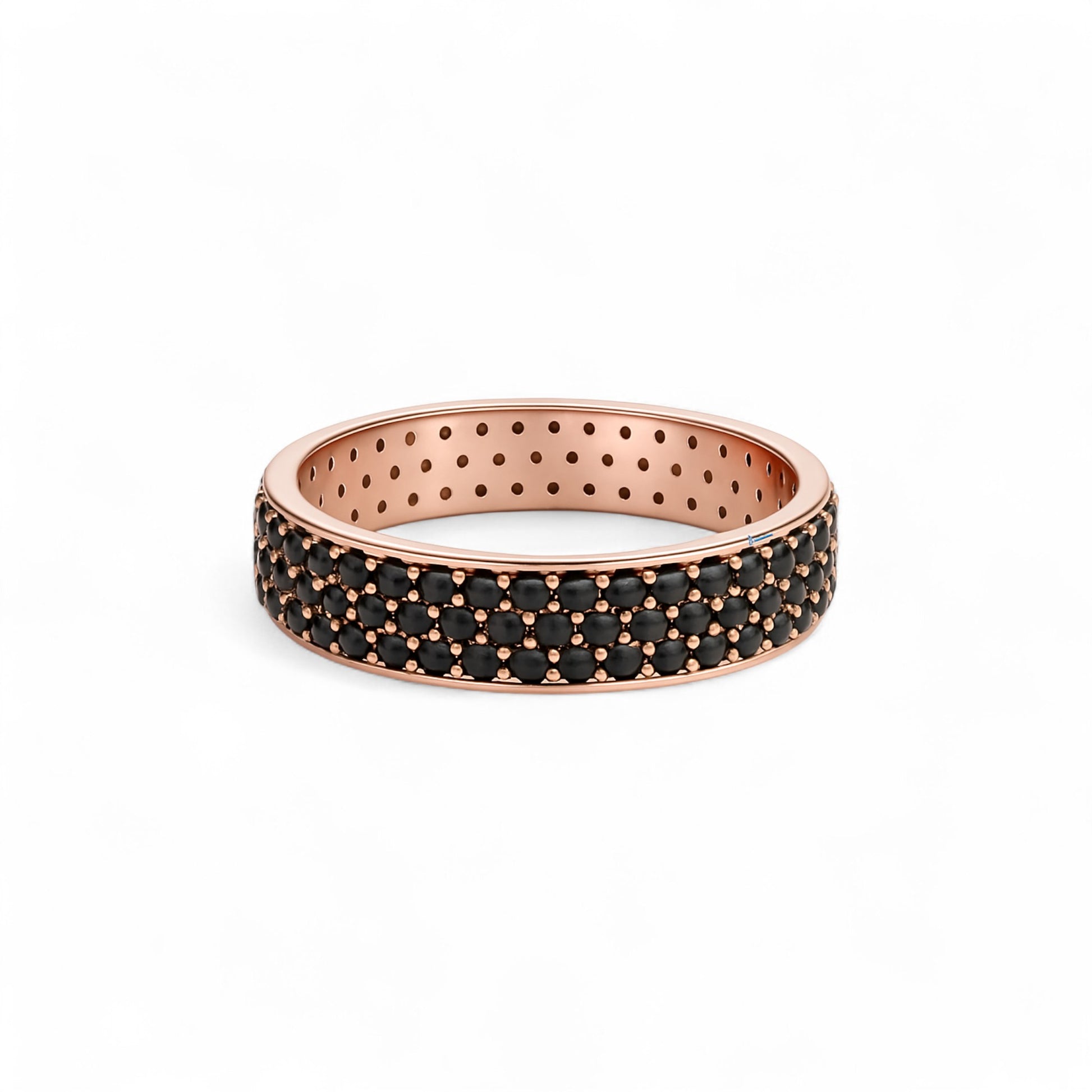 Edgy glamour meets refined luxury in the 360 Black Studded Cubic Zirconia Band. Forged in lustrous 18KT solid gold, this striking band is fully encrusted 360 degrees with jet‑black, precision‑cut cubic zirconia stones. Each facet is set to catch light at every angle, creating a deep, mysterious sparkle that contrasts beautifully against the warm gold backdrop.
