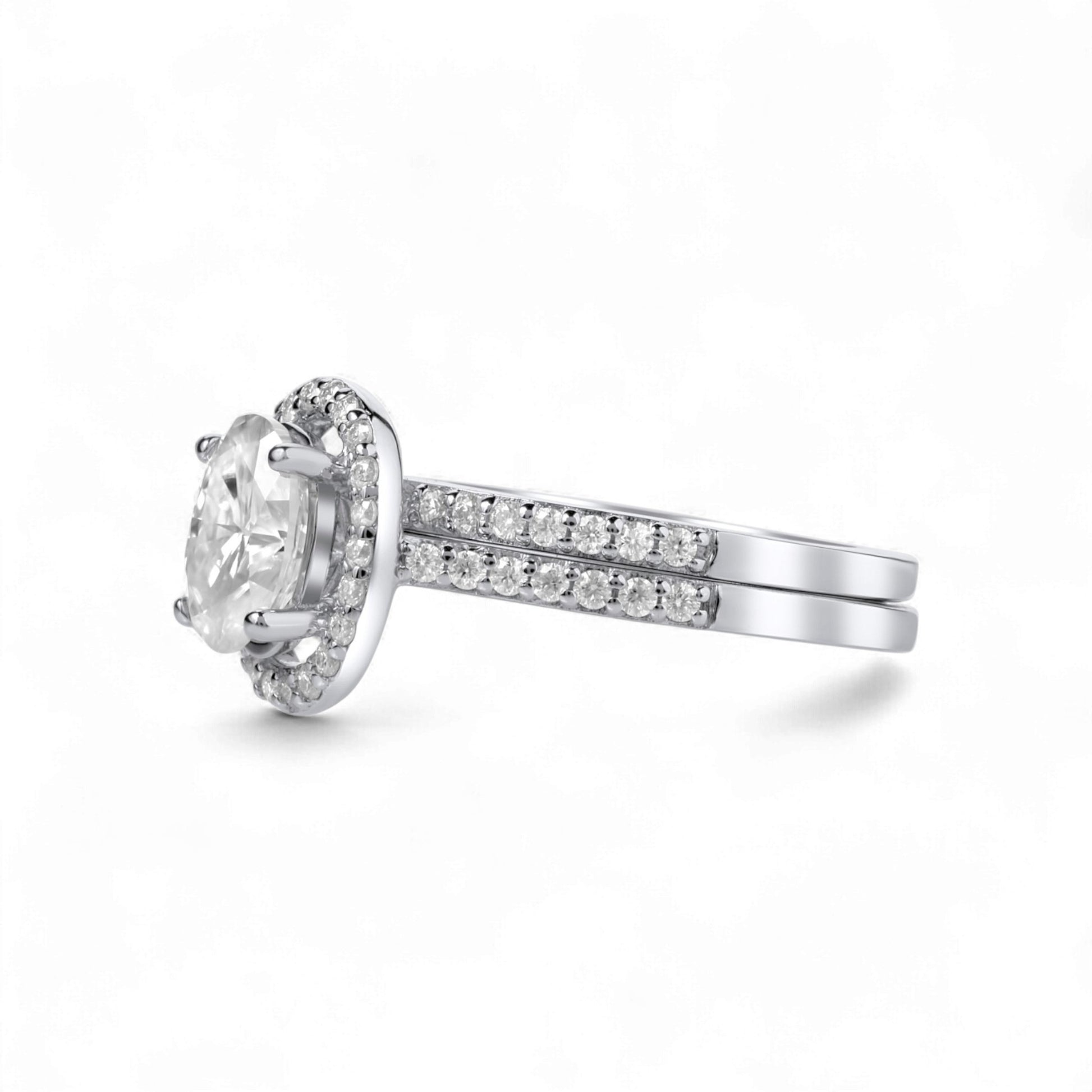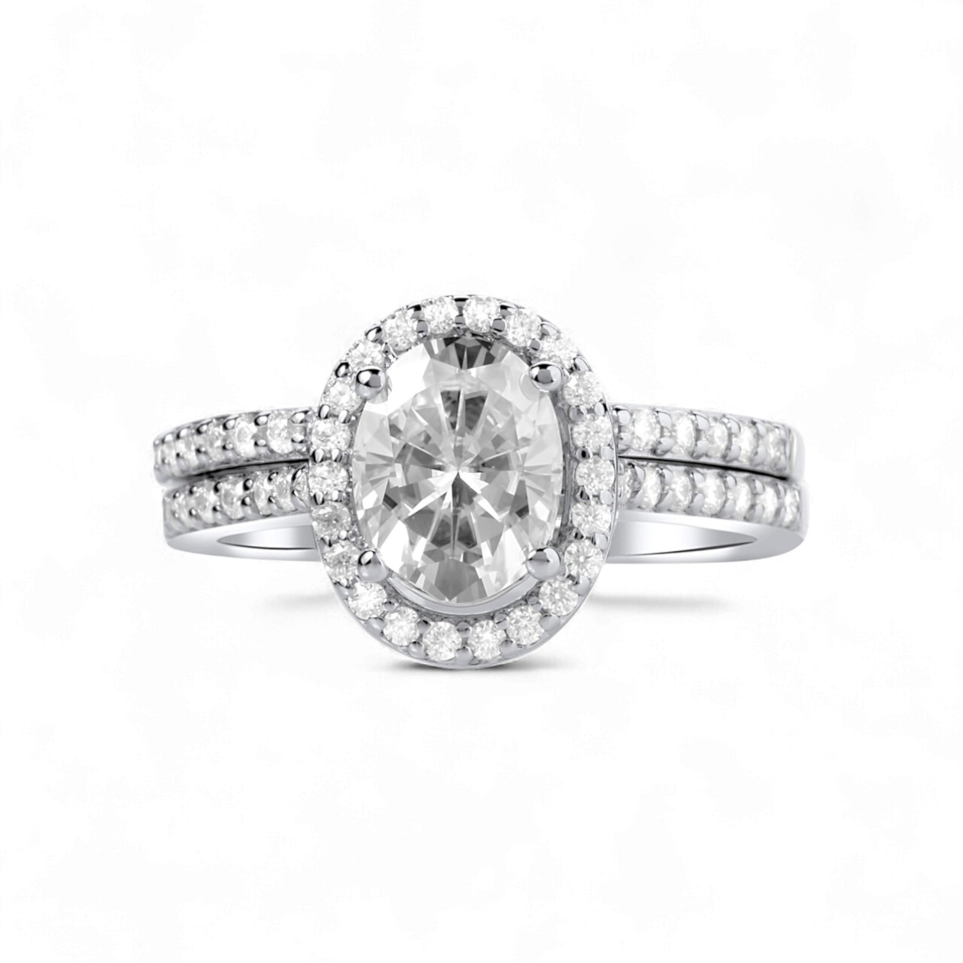 The Classic Oval Cut Moissanite Bride Set in 925 Sterling Silver is a timeless symbol of grace and devotion, featuring a brilliant oval-cut moissanite at its center, framed by a halo of pavé stones that magnify its fire and brilliance. Handcrafted in polished sterling silver, the engagement ring pairs perfectly with a matching pavé wedding band, creating a seamless harmony of elegance and sparkle. The oval cut, celebrated for its elongated silhouette and radiant glow, represents unity, continuity, and everlasting love, making this set the perfect choice for the bride who treasures romance and sophistication.