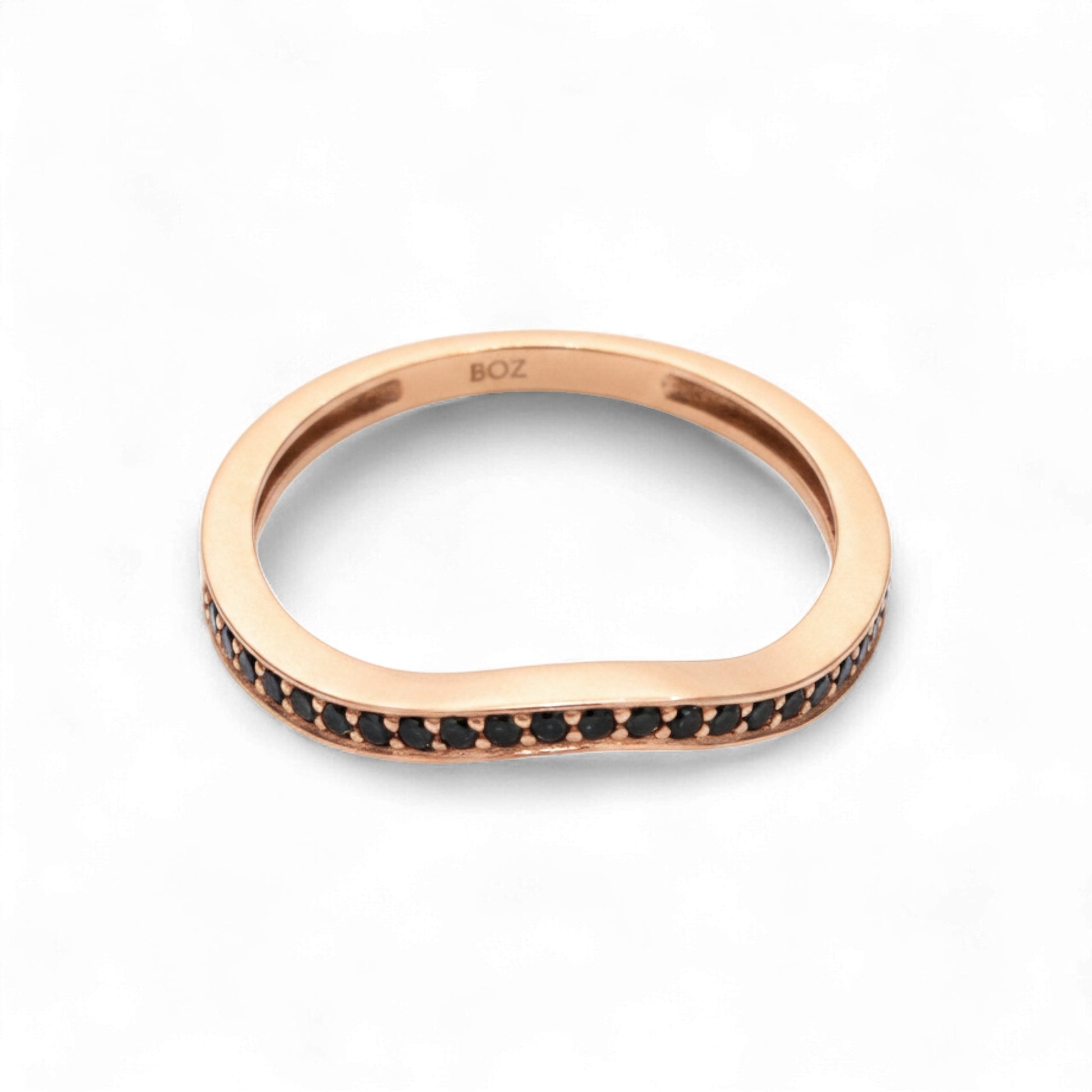 Lined with shimmering black cubic zirconia stones, the curved design adds a modern, dramatic twist to a timeless shape. Whether worn solo, stacked, or paired with an engagement ring, this band brings striking contrast and meaningful beauty to any collection.